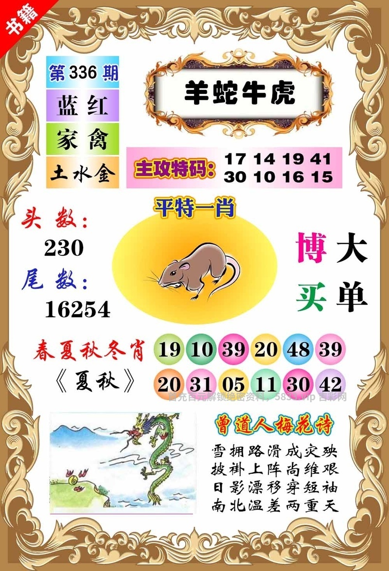 335期曾道人梅花诗:穷尽思索难看透,玄妙两字最迷惑,心无增减且随缘,三星拱照福禄多 解释:穷尽思索难看透,玄妙两字最迷惑,心无增减且随缘,三星拱照福禄多解鼠蛇肖 综合解肖:鼠蛇猪羊马猴龙狗虎 | |||||||||||||||||||||||||||||||||||